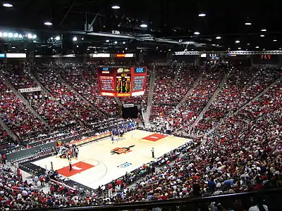 Prior to the opening of the arena, men's basketball played its home games primarily at Peterson Gymnasium (located across the street from Viejas Arena and the current home to the Aztec women's volleyball team), and, for more than 30 years, played on-and-off at the San Diego Sports Arena.[9][10][11]