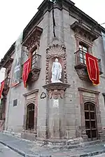 The Casa del Mayorazgo de la Canal dates from the 18th century, constructed by Mariano Loreto de la Canal y Landeta.[5] During the late colonial period, this house was the most important secular building, being home to the De la Canal family, one of the wealthiest in New Spain.[32][34] The original construction was inspired by French and Italian palaces of the 16th to 18th centuries. The house is considered to be a transitional work between Baroque and Neoclassical,[15] as its façade was redesigned by Manuel Tolsá in the early 19th century.[5] The façade is Neoclassical with the coat of arms of the family. The main portal has two levels with an arch and a relief of an eagle on the keystone. The main door is profusely decorated with high reliefs.[5] Today, it houses the Casa de Cultura de Banamex (Banamex Cultural Center), which houses a collection of historic paintings and offers diverse expositions during the year.[37][35]