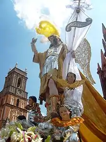 Holy Week begins with an exhibition of altars dedicated to the Virgin of Sorrows and end with the Procession of Silence.[37] Prior to the Procession of Silence, there is a reenactment of the judgment of Jesus by Pontius Pilate, on one side of the San Miguel Parish. Then the procession begins, which represents the fourteen scenes of the Passion before his crucifixion. Many of the townspeople participate in the event, with children dressed as angels and adults in period clothing carrying statues of Jesus. The procession winds its way along the main streets of the historic center completely in silence.[46] Another large religious celebration is the feast of Nuestro Señor de la Columna[47]