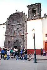 The Nuestra Señora de la Salud Church was built by Luis Felipe Neri in the 18th century. The main portal is in Churrigueresque (Spanish Baroque) style with two levels and a crest in the shape of a large seashell.[5][15] The first level has an arch flanked by pilasters and niches with sculptures of the Sacred Heart and John the Evangelist. The interior has a layout of a Latin cross covered with vaults with side walls covered in oil paintings done by Agapito Ping between 1721 and 1785.[5] One altar contains an image of Christ, the Good Shepherd, defending his sheep from various dangers including a group of unicorns.[34] The church served as the chapel of the Colegio de San Francisco de Sales next door.[35] The Colegio de San Francisco de Sales was as important as the college of San Ildefonso in Mexico City in the 18th century.[15] Both Ignacio Aldama and Ignacio Allende attended school here.[35]
