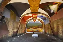 One hall of the old convent is dedicated to a mural by David Alfaro Siqueiros along with students from the art school, but it was never finished.[34] The complex has a museum, an auditorium, two art galleries and the Las Musas restaurant.[30][35] Next to the cultural center is the Inmaculada Concepcion Church, locally known as Las Monjas (English: The Nuns). It was originally constructed as part of the convent. The church was constructed between 1755 and 1842 with an elegant cupola added by Zeferino Gutierrez in 1891, inspired by the Les Invalides in Paris.[35] The cupola is octagonal and decorated with Corinthian columns in the lower area and the upper area has a window with a balustrade and statues of saints. Topping the cupola is a lantern window with a statue depicting the Immaculate Conception.[5] Inside, there are paintings by Juan Rodriguez Juarez.[34]