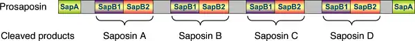 The mamallian prosaposin (domain organization below) is a prototypic family member. It also includes the N- and C-terminal SapA domains, both of which are proteolyticly cleaved as the proprotein matures. Four connected pairs of SapB1-SapB2 domains are released, sequentially named Saposin-A through D. Some closely related proteins, such as PSAPL1 and SFTPB, share the architecture and the cleaving mechanism in whole or in part. While Prosaposin and PSAPL1 act in lysosomal lipid degradation, SFTPB is released into the pulmonary surfactant, playing a role in rearranging lipids.[6]