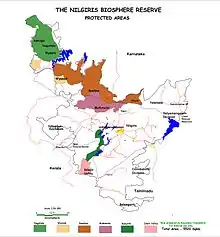 The Sathyamangalam Forest Taluk and corresponding Forest Range was under the charge of the District Forest Officer, Coimbatore. The head-quarters of the range officer was at Cusbah or Head-quarter Station Sathyamangalam (Sathyamangalam in Tamil)[2] Sathyamangalam range was guarded by a forestor who was at Jalamllay, Sathyamangalam with 8 guards.[2] Patches of Sandalwood Reserves were notified under the Indian Forests Act, 1927. The Sathyamangalam Forest Division is part of the Bramhagiri-Nilgiris-Eastern Ghats Elephant Reserve notified in 2003.[1] Sathyamangalam Forest Division was declared a wildlife sanctuary with effect from 3 November 2008 by the Government of Tamil Nadu as per the Wild Life Protection Act of 1972.[3] In 2008, the Government of Karnataka sent a proposal to declare the contiguous Billigiriranga Swamy Temple Wildlife Sanctuary as a tiger reserve which was subsequently approved in 2010.[4][5] In a wildlife survey conducted by the Government of Tamil Nadu in 2010, 46 tigers were sighted in the Sathyamangalam forest area.[6] In July 2010, the Minister of State for Environment and Forests Jairam Ramesh requested the Chief Minister of Tamil Nadu to consider the possibility of proposing the Sathyamangalam wildlife sanctuary as a Project Tiger tiger reserve as per the provisions of the Wildlife Protection Act of 1972 as the area is contiguous with the forests of Bandipur and Mudumalai tiger reserves.[7][4] On 1 April 2010, the Government of Tamil Nadu announced that it would initiate action to declare the sanctuary as a tiger reserve because of the consistent sighting of tigers in the forest area and the tiger reserve declaration would strengthen wildlife conservation efforts, as the sanctuary managers will get more financial support from the central government and the Government of India may also provide support to appoint an additional anti-poaching watchers and fund the establishment of anti-poaching camps.[8]