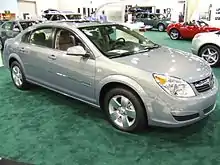 The Aura XR was the top-line Aura model. The XR was fitted with the 3.6 L DOHC V6 with VVT, rated at 252 hp (188 kW) at 6200 rpm and 251 lb⋅ft (340 N⋅m) of torque at 3100 rpm. This engine was first used in the Cadillac CTS as well as the Cadillac STS and marks its third use in a North American GM car. With this 3.6 L engine, the Aura was the first front-wheel drive GM passenger car to use the new Hydra-Matic 6T70 six-speed automatic transmission.[14] The transmission featured TAPshift, which allowed the driver to manually select gears by using paddles located behind the steering wheel.[15] The Aura XR was the performance-oriented version with a taut, but not harsh, suspension and the more powerful engine. Available interior colors in the XR were tan and grey leather (available in the XE), along with the XR-specific black or Morocco Brown leather. Cloth was standard. Other standard features included the Advanced Audio Package, 18 inch alloy wheels, chrome exterior door handles, and remote vehicle start.[16] Given the 2007 Saturn Aura's European roots—the car's chassis was also used for the Saab 9-3. The Aura also used hydraulic power steering (V-6 models only) that provided more feedback and a more linear feel than the fussy electric power-assist units. For 2009, an entry level XR became available. It included the 17 inch 10 spoke alloy wheels available on the XE and the 2.4 L LE5 Ecotec engine mated to GM's all new 6T40 6-speed automatic transmission with TAPshift. The 3.6L VVT with 18" wheels was optional.