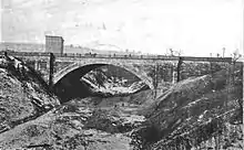 The site of Schenley Plaza was originally a deep gully which was called St. Pierre Hollow as it was near the end of St. Pierre Street (now Bigelow Boulevard).[3] In 1898, a stone arch bridge called the Bellefield Bridge was built over the hollow, which together with the Schenley Bridge provided an entrance into Schenley Park from Forbes Avenue.[4]