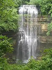 Virgin Falls, one of the area's most well-known and unique features, emerges from an underground stream on the south slope of Little Chestnut Mountain, drops 110 feet (34 m), and vanishes underground again. The source of the water for Virgin Falls is Virgin Falls Cave. The lower mouth to this cave is located approximately 150 feet upstream from the lip of the Falls. Virgin Falls Cave trends roughly southwest for 3,000 feet before ending in a massive ceiling collapse (breakdown). The cave stream easily flows through this breakdown, but no passage through the breakdown has been discovered. The cave itself is mainly one very large (30 feet wide and 40 feet high) stream passage. At the base of Virgin Falls, the water flows approximately 10 feet and falls into a large pit, the entrance to Virgin Falls Pit. At the bottom of this pit, the water follows cave passages and emerges as a spring at the base of the Cumberland Escarpment.[2]