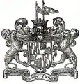 The supporters are a plowman (dexter) and a fisherman (sinister), the former holding a spade and the latter a fish; the mantling of ermine (reverse Gules) is entire and surrounds the whole composition. The crest is a crown with two pennants, the dexter Or and the sinister Sable.[2]