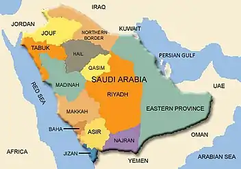 Sectarianism in Saudi Arabia refers to the Saudi government's “top-down push towards sectarian polarization” between the Sunni majority, and Shi'ite minority.[1] This encompasses anti-Shi'ite policies by the Saudi regime, as well as tensions between the Sunni majority and the Shi'ite minority. The Saudi government is often viewed to be oppressing the Shi'ite community, who constitute up to 15% of the Saudi population.[2] This occurs against the backdrop of the broader Iran-Saudi Arabia proxy conflict, since Iran is a Shi'ite republic.[3]