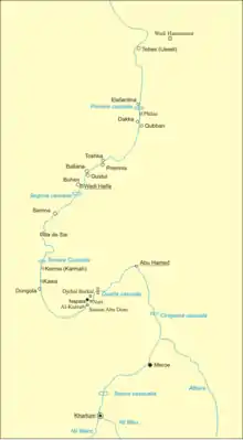 The region of Semna is 15 miles south of Wadi Halfa and is situated where rocks cross the Nile narrowing its flow—the Semna Cataract.[1][2]