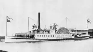 From the beginning, Shady Side was involved in stern competition with vessels of other companies. The Shady Side was the fastest boat of the Morrisania Steamboat Company, and frequently raced against the Sylvan Dell, which was the fastest of the Harlem Line. In 1875, as part of this sparring, the Sylvan Dell had a piece of oak strapped to her to prevent Shady Side easily passing. Captain Longstreet, superintendent of the Morrisania line, took control of Shady Side in response one morning in April 1875 and swung her around in such a way as to knock the beam off Sylvan Dell. This caused cheering from passengers on Shady Side but was condemned as dangerous horseplay by The New York Times.[6] Later that month, Captain Longstreet's license was revoked for thirty days as a result, and the captains of both the Shady Side and Sylvan Dell—Charles G. Tennant and William Weatherwax, respectively—were censured, Tennant for remaining at the helm while Longstreet took over and Weatherwax for continuing to operate the Sylvan Dell after complaints had been raised about the beam.[7][8]