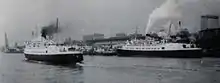 RMS Ben-my-Chree (left) receives a rousing salute from her older sister RMS Manx Maid (right) as she makes her way down the River Mersey for her Maiden Voyage from Liverpool to Douglas, May 12th, 1966.