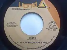 "Signs" is a song by the Canadian rock group Five Man Electrical Band. It was written by the band's frontman, Les Emmerson, and popularized the relatively unknown band, who recorded it for their true first album, Good-byes and Butterflies, in 1970. The LP "Five Man Electrical Band" had begun as a Staccatos album with Brian Rading, the band's bassist suggesting the band's new name from the song title.