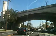 In 1904, the Fletcher Drive Viaduct was constructed at the northeastern boundary of Silver Lake for the Glendale Line of the Pacific Electric Railway Company, connecting the area to Downtown Los Angeles. Originally constructed of timber, the viaduct was replaced in 1928 by a steel span construction to make way for Fletcher Drive underneath it. It was demolished in 1959 and only its concrete footings remain.[18]