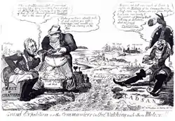 ![]() Sir William Curtis (centre) in an 1809 caricature on the Walcheren Expedition, between military commanders John Pitt, 2nd Earl of Chatham and Marshal Bernadotte | |