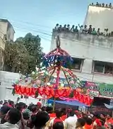 Sirimanothsavam, (Telugu: సిరిమాను పండుగ, సిరి మాను ఉత్సవం) (also referred to as Sirimanu Uthsavam, Siri Manu Fete/Festival, Sirimanu Panduga) is a festival organized to propitiate Goddess Pyddithallamma of Vizianagram Town. Siri means "goddess Lakshmi in other words wealth and prosperity " and manu means "trunk" or "log". The priest of the temple, while taking procession between the fort and temple three times in the evening, hangs from the tip of the long, lean wooden staff (measuring 60 feet), raised high into the sky. The priest possessed by the goddess would himself tell a few days before, where this manu would be available. It is from that place only the log has to be procured.[1] Hanging from the upper end of the staff, which is raised high into the sky, is a very risky exercise, but it is believed that the grace of the Goddess protects the priest from falling off. It is held in the month of September or October (Dasara) of every year. It is a great carnival attended by two to three lakhs of people from the neighboring towns and villages.[2] The Rajas of Vizianagaram oversee the arrangements for this event. The APSRTC runs about 250 buses from different parts of the state to facilitate transport of devotees to Vizianagram to attend this festival.[3]