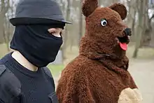 The colourful procession borrows motifs from similar carnival events: the bear was traditionally tied with a straw rope, typical for ber, a traditional procession popular across Greater Poland.[7] Today the bear wears fluffy, brown clothes and a mask. A chain is tied around the bear's waist and its jangling alerts residents about the Greys' approach.