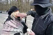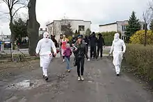 The police officer is another indication of the syncretic way of selecting procession characters: this character resembles the leader of similar żandary parades from Poznań.[8] The police officer leads the procession, marches in the front and chooses the route. Police officers stop cars passing by to give the drivers "holiday fines" and knock on the doors of nearby houses so the hosts admit the procession and offer the participants some refreshments. The police officer collects donations offered by passers-by, drivers or other people. The person playing this role must be sociable and able to integrate the group and make people laugh.