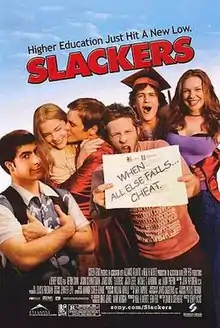 Slackers is a 2002 American comedy film directed by Dewey Nicks and starring Jason Schwartzman, Devon Sawa, Jason Segel, Michael Maronna, Jaime King, and Laura Prepon. Its plot follows a nerdy college student who blackmails a group of young men with his knowledge that they have cheated throughout college, and uses it to get closer to a young woman he is obsessed with.