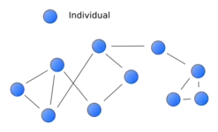 The density of a given social network is found by dividing the number of all existing links between the actors by the number of potential links within the same set of actors.[2] The higher the resulting number, the denser a network is. Dense networks are most likely to be found in small, stable communities with few external contacts and a high degree of social cohesion. Loose social networks, by contrast, are more liable to develop in larger, unstable communities that have many external contacts and exhibit a relative lack of social cohesion.[3]