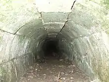 During excavations a drainage culvert was discovered about 20 m (22 yd) west of Terminus bridge.[30] Work resumed in September and November 2014 to batter and reshape the canal embankments. Excess topsoil was removed and the towpath reinstated on the stretch to the east from Terminus bridge for about 200 m (220 yd). On the same stretch a retaining wall was discovered in the south embankment continuing for about 100 m (110 yd), possibly built as a repair to a weak section of canal banking. Vertical infills of white clay have been used along this wall.