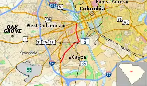 SC 2 is a 3.9-mile (6.3 km), two-lane road just southwest of Columbia, serving as a business route for Cayce. It begins at the US 21/US 176/US 321 concurrency heading northeast. It then takes a turn to the north and runs parallel to the Congaree River to its west. Shortly after passing US 1, the highway ends at US 378 in West Columbia. The highway runs by an elementary school, Brookland-Cayce High School, two shopping centers, and a park.[2]