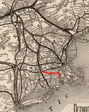 The main route would have gone through Woonsocket, Rhode Island to downtown Providence, with a branch around the west side to the docks south of downtown. The former route, leading into Providence Union Station, was planned to pass through a tunnel under Smith Hill, on which little if any construction was undertaken before cessation of work in Rhode Island.