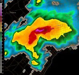 The Toronto Supercell maintained all the characteristics of a tornado producer as it approached the city. Convective storm detection showed on weather radars a hook echo, a BWER and a strong mesocyclone but the vortex left the ground after the second tornado.[3] Studies were made to try to explain the change in behavior to an extremely high producer of rain. One area of Thornhill, just north of the Toronto City limits recorded 175 millimetres (7 in) of rain in less than one hour.[1][3]