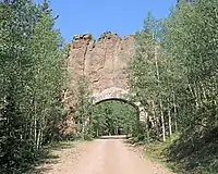 Among the most unusual features of the Spanish Peaks are the great dikes which radiate out from the mountains like spokes of a wheel. These walls of rock are often spectacular. They are easily visible from the highway north of the peaks (and west of Walsenburg), and pictures of them have been used as type examples in more than one introductory geology textbook. Several can be easily seen up close on back dirt roads, and one (Apishapa Arch) on the south side of the peaks can actually be driven through.