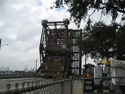 The St. Claude Avenue Bridge is a bascule bridge with four vehicular lanes over the Industrial Canal in New Orleans, Louisiana. The bridge was designed by the Strauss Bascule Bridge Company of Chicago and built in 1919 by the Bethlehem Steel Bridge Corporation.[1][2] It was originally a combination railroad and automobile bridge, with two pairs of railroad tracks in the center of the lift span and automobile lanes straddling it. The railroad is no longer there, its place on the bridge taken by additional vehicular lanes. One lane in each direction passes through the truss of the bridge and one lane passes alongside the truss. The bridge is integrated into the Industrial Canal Lock structure, on the river side of the lock chamber; it raises when marine traffic enters or exits the lock.