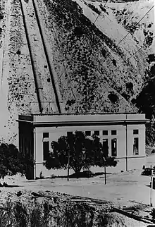 It was during the process of building the aqueduct that Mulholland first considered sections of San Francisquito Canyon as a potential dam site. He felt that there should be a reservoir of sufficient size to provide water for Los Angeles for an extended period in the event of a drought or if the aqueduct were damaged by an earthquake.[10] In particular, he favored the area between where the hydroelectric power plants Powerhouses No. 1 and No. 2 were to be built, with what he perceived as favorable topography, a natural narrowing of the canyon downstream of a wide, upstream platform which would allow the creation of a large reservoir area with a minimum possible dam.[11] A large camp had been set up to house the workers near this area, and Mulholland used his spare time becoming familiar with the area's geological features.