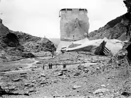 Concrete block from the west abutment of the dam about half a mile below the dam site. Approximately 63 ft. long, 30 ft. high and 54 ft. wide (19.2 m × 9.1 m × 16.5 m). The wing wall is in the distance.