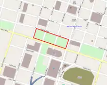 Kiener Plaza occupies the full width of the Mall between North 7th Street and North Broadway. It sits immediately north of the Ballpark Village, developed in the early 21st century. The land is owned by Southern Real Estate and Financial Company and leased to the city of St. Louis.[3]