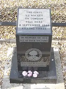 On Friday 8 September 1944, a V-2 launched from Wassenaar in Holland, by 485 Artillerie Abteilung at 6.37pm,[1] landed in Staveley Road near the junction with Burlington Lane, killing three people (including a three-year-old girl), and injuring nineteen.[2] The crater was thirty feet across. Earlier that day at 8.39am, a V2 had hit Maisons-Alfort in France, where six people were killed; the V2 had been launched from Petites-Tailles, near Houffalize, in south-east Belgium by Lehr und Versuchsbatterie 444.[3]