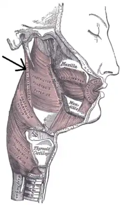 On the lateral pharyngeal wall, it is situated posterior to the superior constrictor muscle, and anterior to the buccopharyngeal fascia.[1]