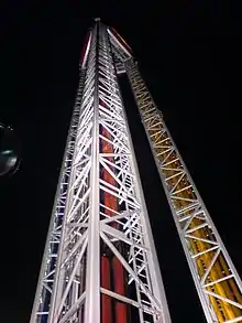 Superman: Tower of Power is a drop tower ride currently located at two Six Flags parks,[1] and two former installments at Kentucky Kingdom and Six Flags St. Louis. Two of the four drop towers were manufactured by Intamin, while the Six Flags Over Georgia version was made by Zamperla, and the Six Flags Over Texas version was made by S&S. The installment at Kentucky Kingdom (then known as Six Flags Kentucky Kingdom) was demolished after an accident that maimed a teenage girl while the ride at Six Flags St Louis was removed from the park's website in early 2021.[2][3] Three additional drop towers of the same model by S&S are installed at other Six Flags parks Six Flags New England and Six Flags Fiesta Texas, each known as Scream and one more built at Six Flags Great Escape and Hurricane Harbor known as Sasquatch.
