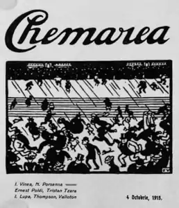 From late 1914 to early 1916, during the period when Romania conserved its neutrality while World War I raged in neighboring areas, the new Symbolist generation was also radicalizing itself on political grounds, identifying with ideals such as pacifism and proletarian internationalism.[239] The political message was expressed through a number of publications that were both literary and polemical in nature: Arghezi's Cronica, Bogdan-Pitești's Seara and, most subversively, Cocea's Facla and Chemarea.[240] The latter was edited by Vinea, and primarily functioned as an avatar of Cocea's political press, surfacing and resurfacing under various names in his attempt to elude wartime censorship.[241] Its cultural agenda and its move away from Symbolism were however identified by Paul Cernat in the disparate graphic and literary elements: cover reproductions of works by Félix Vallotton; Tzara's first non-Symbolist poems and Vinea's own "incisive" program; satirical pieces ridiculing Nicolae Iorga's new publications and the neo-Sămănătorist current; polemics with the supporters of Romanian Symbolism at Vieața Nouă and Flacăra.[242] Rather than constituting a voice for the avant-garde, Cernat notes, Chemarea symbolized a moment when "the Romanian pre-avant-garde plugged itself into the pulse of a European-wide sensitivity touched by the radical crisis of its dominating values."[243] Similarly, Sandqvist (building on previous assessments from Romanian writer Eugène Ionesco), discusses the Chemarea group as a Symbolist faction, borrowing freely from the avant-garde.[244]