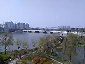 The lake located in Qingtong town, 15 kilometres (9 miles) north of Jiangyan city. The water comes from the Nanhu (南湖), Xique (喜鹊湖), and Beihu (北湖) rivers. It is part of Qintong Swamp.