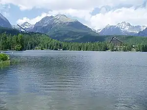 The area around the settlement of Štrbské Pleso is a drainage divide for two drainage basins. To the east of this divide, streams are the headwaters of the Poprad River, of the Baltic Sea drainage basin. To the west of the divide streams are tributaries of the Váh, of the Black Sea drainage basin. The most popular waterfalls include Studenovodské vodopády, Kmeťov vodopád, Vajanského vodopád, Roháčsky vodopád, and Vodopád Skok.[3]