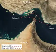 The British government created the Indo-European Telegraph Department in 1862 to connect a telegraphic link between Karachi and lines in the Ottoman Empire. It planned to run the cable along the Makran coast between Fao, Bushire, and Gwadar. A number of local agreements were made with tribal leaders along the proposed route and a cable laid from Karachi as far as Gwadar. However, the Persian government declined to grant permission to extend the line to Ottoman territory. Attention was focused on the Persian Gulf and, following a report by Lieutenant Colonel Patrick Stewart, a decision was taken to lay a cable to Musandam from Gwadar.[5]