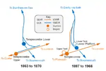 The two railway lines were initially linked by a north-to-east curve; trains from the S&DJR reversed and ran along a separate line next to the single-track Templecombe to Gillingham line to reach the Upper station to allow passengers to connect with main line trains. In March 1870 this connection was closed and a new north-to-west curve was opened that brought S&DJR trains directly to a third platform at the Upper station; this allowed the S&YR line to be doubled. A second locomotive was coupled to the back of the train to facilitate the reversals necessary to move the S&DJR trains in and out of the station. In January 1887 the Lower station was closed and replaced by Templecombe Lower Platform a little further south, but since 1867 many S&DJR trains had called only at the Upper station. The original Lower station was absorbed into the goods yard and locomotive depot.[1]