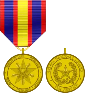 The medal pendant is of bronze, 1-1/4 inches in diameter. On the obverse side is a five-pointed star, one point up, 3/4 of an inch in diameter; superimposed on the star is a Roman two-handed sword, point down, with crossed branches of olive and live oak; in the reentrant angles, there are three raised rays (3/16 of an inch). The star is encircled by the words "MERITORIOUS SERVICE" along the upper arc, "TEXAS NATIONAL GUARD" along the upper arc, and "FOR SERVICE" along the lower arc, in raised letters. The medal pendant is suspended by a ring from a moiré silk ribbon, 1-3/8 inches long and 1-3/8 inches wide, composed of stripes of red (1/8 of an inch), blue (1/4 of an inch), red (1/8 of an inch), yellow (3/8 of an inch), red (1/8 of an inch), blue (1/4 of an inch) and red (1/8 of an inch).[2]