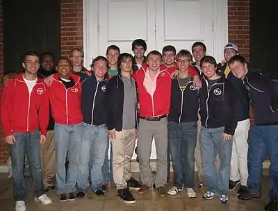 The Academical Village People (AVP) is an a cappella group at the University of Virginia founded in 1993 by a group of people who vowed to "never take themselves too seriously."[1] They set themselves apart from other groups by being able to keep professional while maintaining their lax attitude, wild antics while performing, and their less traditional uniform of a garage mechanic style shirt. The name "Academical Village People" comes from Thomas Jefferson's Academical Village at the university in Charlottesville, Virginia.[2] As of 2017, AVP, as it is often called for short, has released thirteen studio albums, including a greatest hits album, DECADEmical: Best of 1993-2003, of its first ten years in existence.[3] The group has recorded many notable performances such as opening for Dana Carvey[4] and Girl Talk, performing for Reba McEntire at the White House, concerts at the Kennedy Center, and performances in such countries as England, Spain, and Scotland.[5]