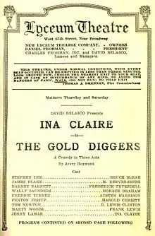 The Gold Diggers is a play written by Avery Hopwood. It popularized the use of the term "gold digger" to refer to women who seek wealthy partners, as opposed to the earlier usage referring to gold miners. Producer David Belasco staged it on Broadway in 1919, with Ina Claire in the lead role. It was a hit, running for two consecutive seasons before going on tour.
