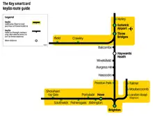 keyGo is a pay-as-you-go system which can be added to Key smartcards provided by Govia Thameslink Railway.[4][5] It is also valid for pay-as-you-go and PlusBus travel on some MetroBus and Brighton & Hove buses, as well as on GTR services between many stations on their network.[6]