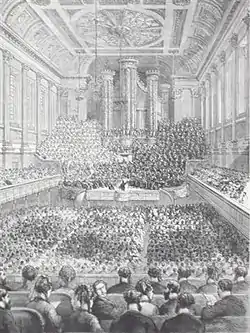 The Duke was present at the premiere at the Birmingham Festival on 27 August 1873.[6] The soloists were Thérèse Tietjens, Zelia Trebelli-Bettini, John Sims Reeves and Charles Santley.[7] As Sullivan appeared on the platform to conduct his new work, he was met with a "hearty and unanimous greeting.... The last outgrowth of his genius leaves far behind all that preceded it", reported The Times.[8] The President of the Festival, the Earl of Shrewsbury, publicly congratulated the composer at the end of the performance,[5] amidst the cheers of the audience.[9]