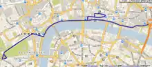 A different route, 12 km in length, between the Tower of London and Buckingham Palace, was again closed to motor vehicles all day (between 09:30 and 16:30) and open to cycles.[9] Local 'hubs' at the Emirates Stadium in Islington, Victoria Park, Clapham Common and Ravenscourt Park provided meeting points and guided rides to the event.[10]