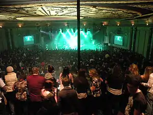 There is a large tiled-floored front lobby with marble accessories that slopes up into the main portion of the theatre, which contains a large blue and white domed ceiling, a grand balcony for VIP seating, a concession stand, wood paneled floors, and columned walls.[1] The interior design of the theatre has a vintage and historical look, adorned with crimson, gold, and black accents that match the original style of the 1920s.[1] There is a large, maple-wood bar in the back center of the theatre and a bar on the left side of the balcony as well. Offices, meeting rooms, and dressing rooms are located on the upper level of the theatre. Two large projector screens hang to the right and left of the stage, directly in front of the elevated floor sections.