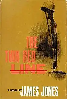 The Thin Red Line, originally published in September 1962,[2] shares its central characters with Jones's other two World War II novels, though with their names necessarily altered, and examines their different reactions to combat. Jones had originally intended the central male characters of his previous war novel From Here to Eternity to appear in this work. But Jones remarked that "the dramatic structure—I might even say the spiritual content—of the first book demanded that Prewitt be killed at the end of it". Jones tackled the problem by changing the names of the three characters of the first novel, enabling them to appear in The Thin Red Line. The character of Prewitt became Witt, Warden became Welsh and Stark became Storm.[2] (Jones's later novel Whistle (1978), features a similar set of characters, now named Sergeant Mart Winch, Bobby Prell, and Johnny "Mother" Strange; Corporal Fife in The Thin Red Line also reappears as company clerk Marion Landers in Whistle.)