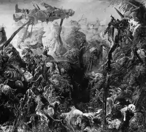 - "In the cold, sallow, ghostly light of dawn…a trench appears into which a devastating bombardment has just descended. A poisonous sulphur yellow pool glistens in the depths like a smirk from hell. Otherwise the trench is filled up with hideously mutilated bodies and human fragments. From open skulls brains gush like thick red groats; torn-up limbs, intestines, shreds of uniforms, artillery shells form a vile heap... Half-decayed remains of the fallen, which were probably buried in the walls of the trench out of necessity and were exposed by the exploding shells, mix with the fresh, blood covered corpses. One soldier has been hurled out of the trench and lies above it, impaled on stakes."
