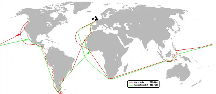 Thomas Cavendish's circumnavigation was a voyage of raid and exploration by English navigator and sailor Thomas Cavendish which took place during the Anglo–Spanish War between 21 July 1586 and 9 September 1588. Following in the footsteps of Francis Drake who circumnavigated the globe, Thomas Cavendish was influenced in an attempt to repeat the feat. As such it was the first deliberately planned voyage of the globe.[4]